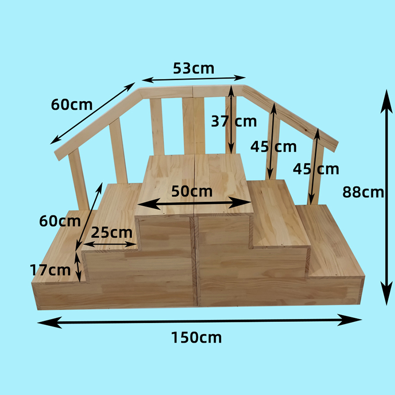 1、雙向樓梯:全梯長150厘米,梯寬60厘米(不含扶手),平臺高51厘米,全梯總高88厘米(含扶手)。上平臺長50厘米,寬60厘米。每層踏板梯面寬25厘米,高17厘米,長60厘米。從一層、二層踏板梯面計(jì)算,梯欄高約45厘米,從三層踏板梯面計(jì)算,梯欄高約37厘米。扶手橫截面3厘米×6厘米。